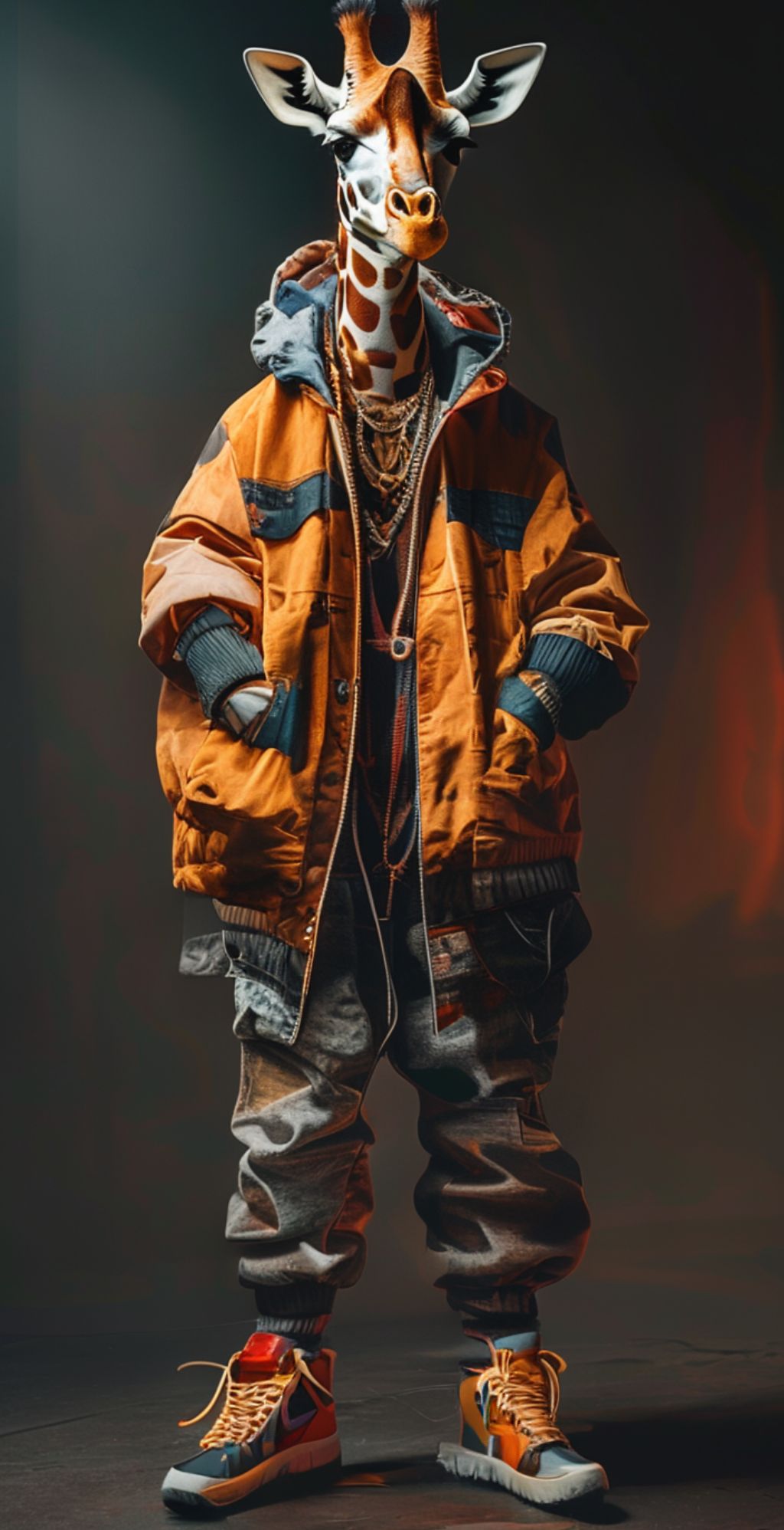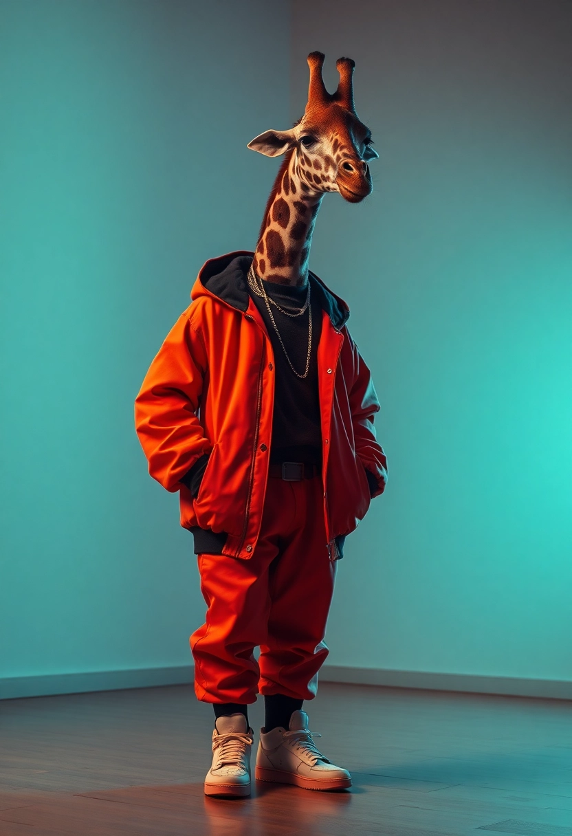 Fashion photography of a anthropomorphic giraffe dressed in large hiphop clothes from 1980s , wearing sneakers , Sony Alpha α7, ISO1900, volumetric lighting,