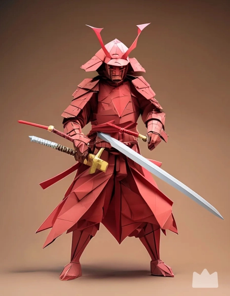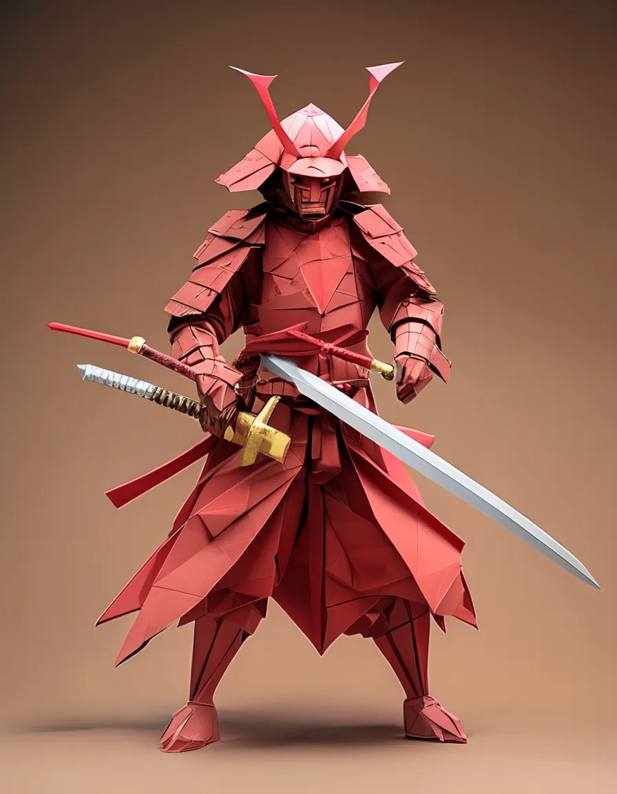 An origami-style samurai red, with a white sword, 4k