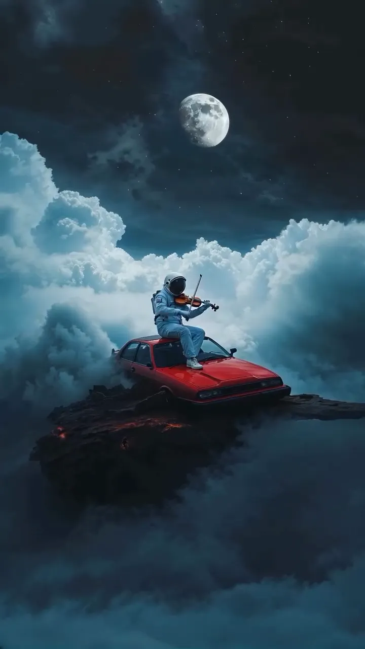 An astronaut playing a violin while sitting on a red car, floating on a rocky platform above the clouds at night. The full moon glows brightly in a starry sky, with thick, dramatic clouds surrounding the scene. The mood is ethereal, serene, and cinematic, with soft lighting and slow atmospheric motion. A surreal dreamscape blending space exploration with classical music in the sky.