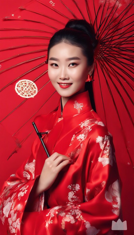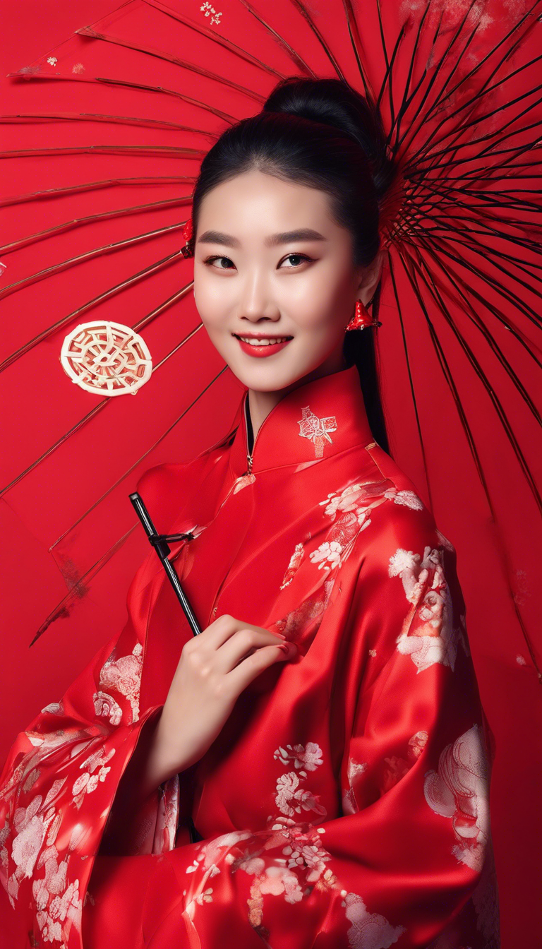 a young model dressed in Chinese clothing is posing with a umbrella in front of a red background, snowflake. solid color red background, Excellent skin texture, Smiling expression, cheerful atmosphere, in the style of eye-catching resin jewelry, Beauty product advertising, photo studio, the stars art group, xing xing, matte photo, minimalist beauty, meticulous linework precision, feminine beauty
