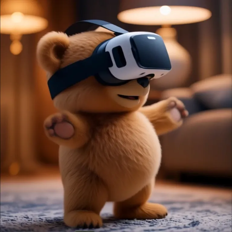 A little bear is wearing an HMD and having fun playing a VR game in his room