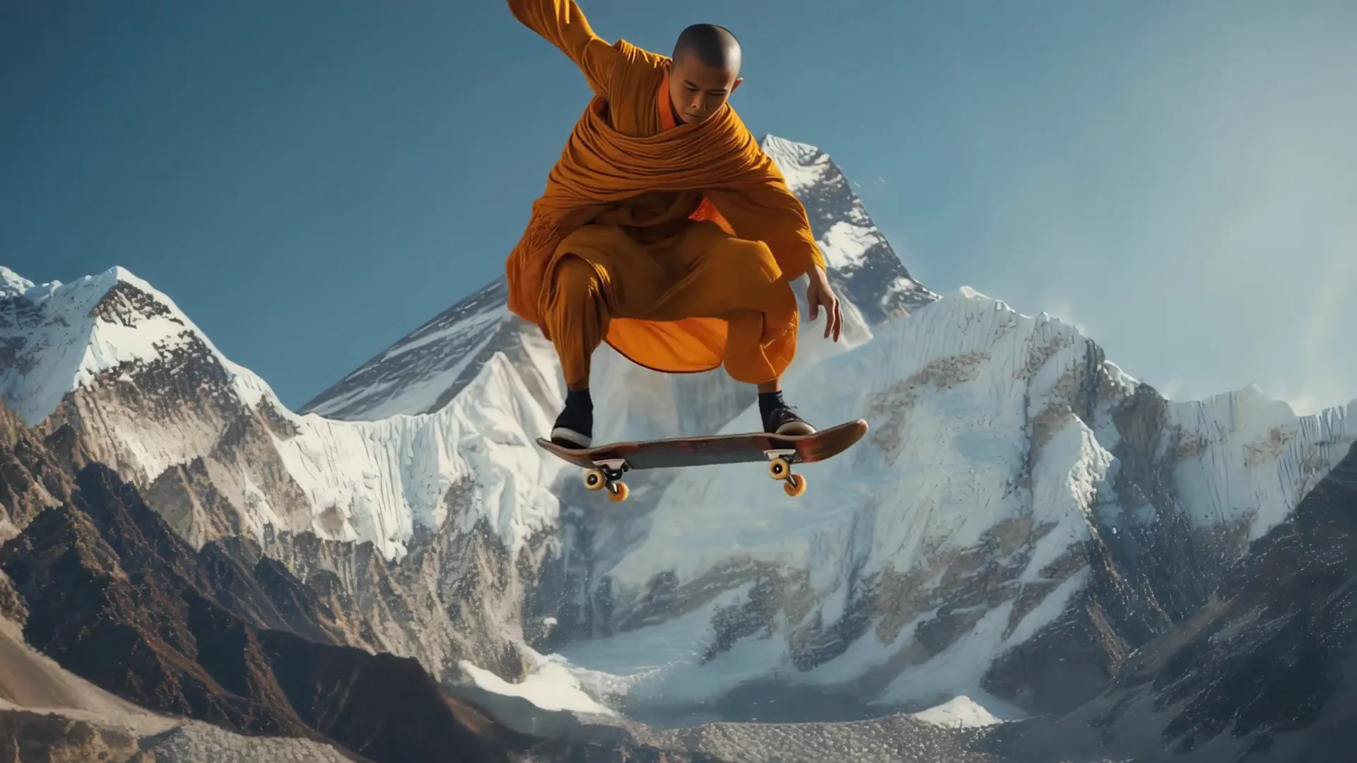 A skateboarder executing a perfect kickflip in mid-air, sunlight illuminating dust particles, gritty urban backdrop, detailed skateboard graphics, dynamic motion blur, hyperrealistic rendering, 8k resolution, cinematic lighting.