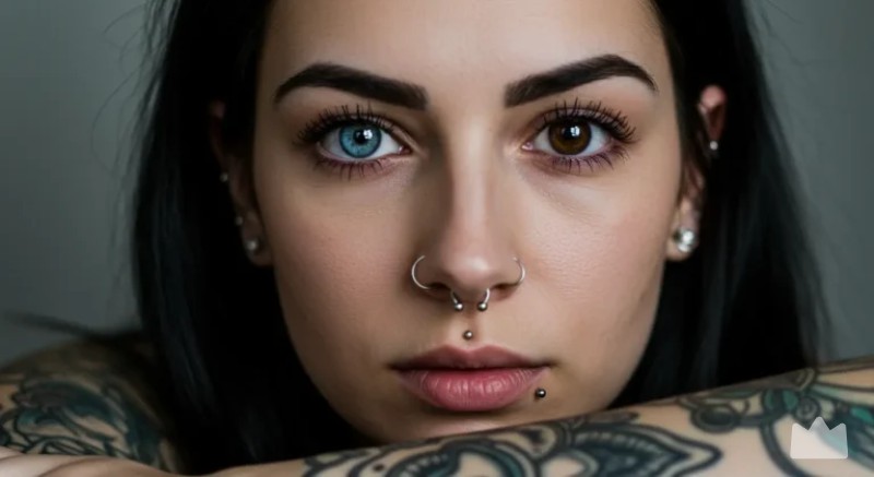 A young woman with vibrant, colorful tattoos covering her arms and shoulders, deeply engaged in conversation, smiling warmly. Close-up shot, focusing on her expressive face and intricate tattoos. Detailed, realistic style, soft lighting.