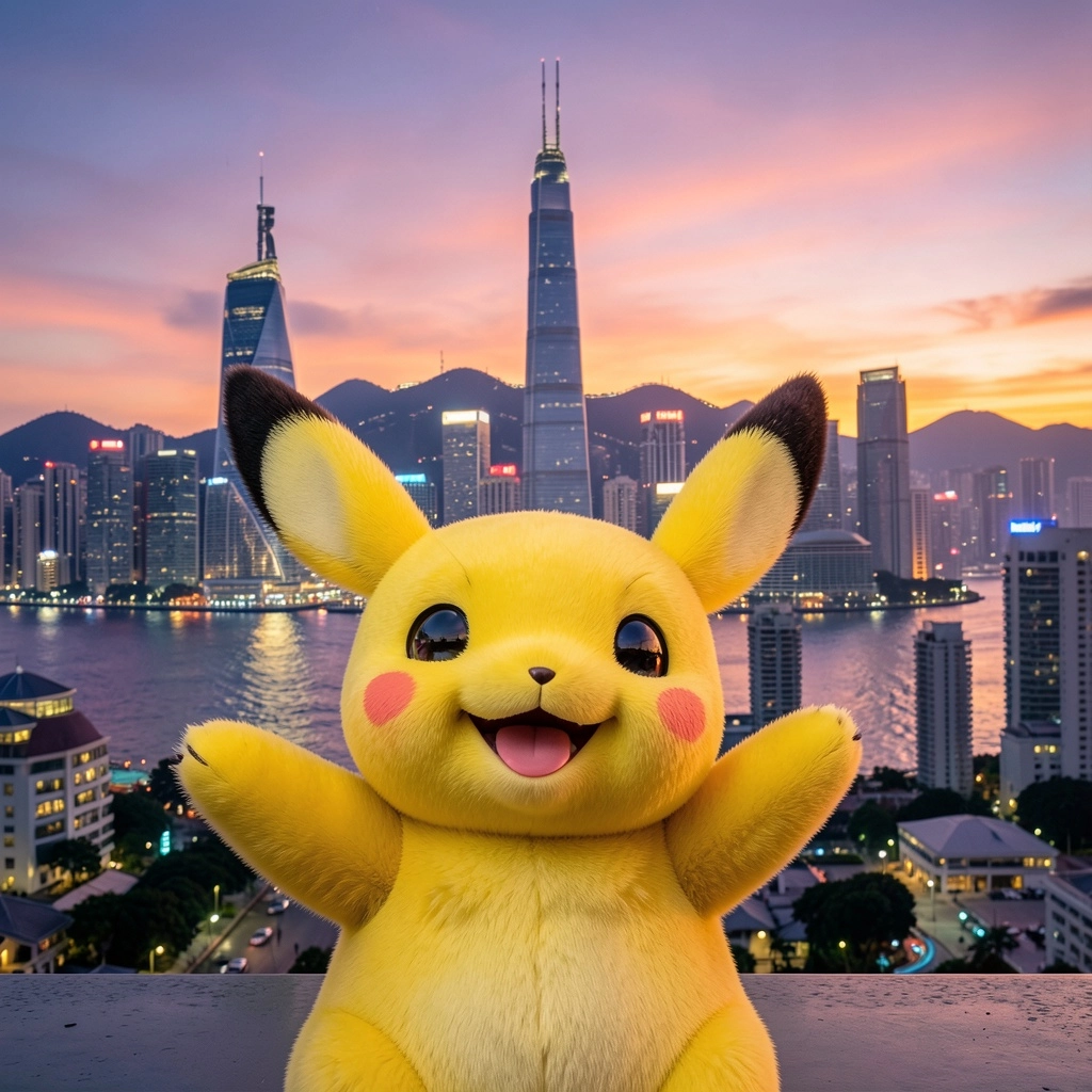 A very realistic and detailed 4k picture of Pikachu, smiling, background China at evening around sunset, beautiful colors